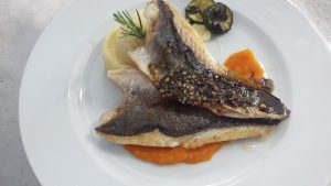 File bele ribe z bučnim pirejem, pestom in maslenim krompirjem